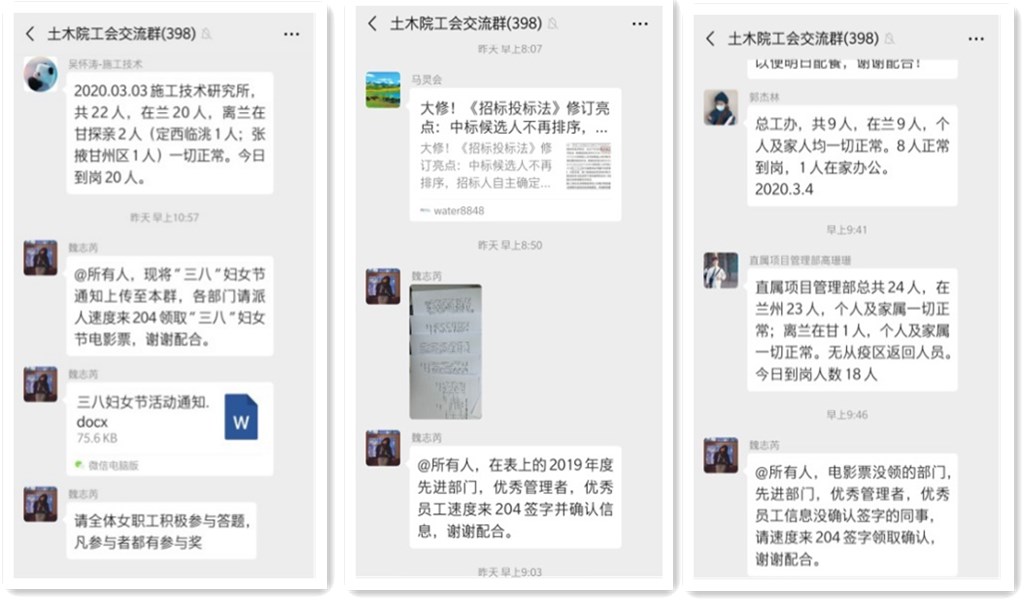 依托微信平臺,加強對公司日常工作管理、信息發布、疫情發展趨勢、職工人員信息進行收集管理,做好日常管理、防控、監督、宣傳工作。