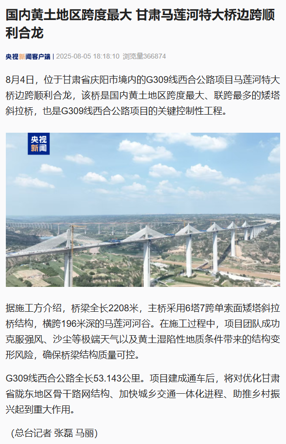 近日,由甘肅工程咨詢集團旗下省交通監理公司承監的G309線西合公路項目建設取得重大進展——馬蓮河特大橋邊跨順利合龍。項目建成后,將進一步完善區域路網結構,對促進慶陽地區經濟社會發展具有重要意義。
